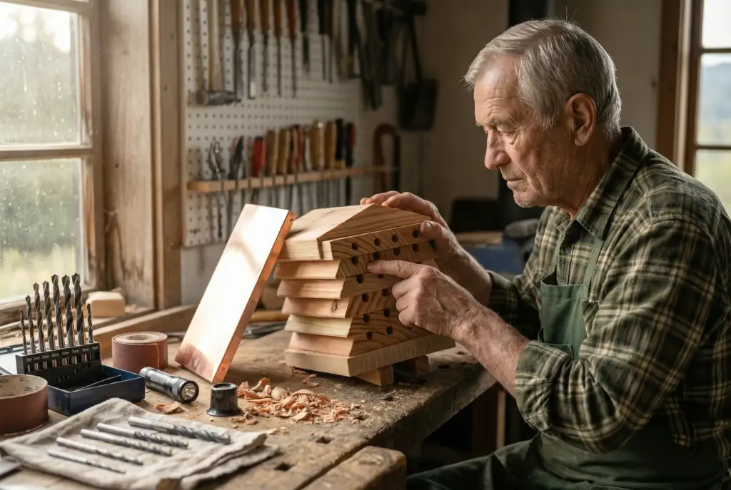 Wenn man Heinrich auf industrielle Insektenhotels anspricht, wird der ruhige Thüringer deutlich. „Die Leute kaufen diese Dinge mit den besten Absichten“, sagt er und lässt den Hobel sinken. „Aber was sie nach Hause tragen, ist Dekoration – kein Lebensraum. Es ist, als würde man versuchen, in einer Ruine aus Pappe Schutz zu finden.“