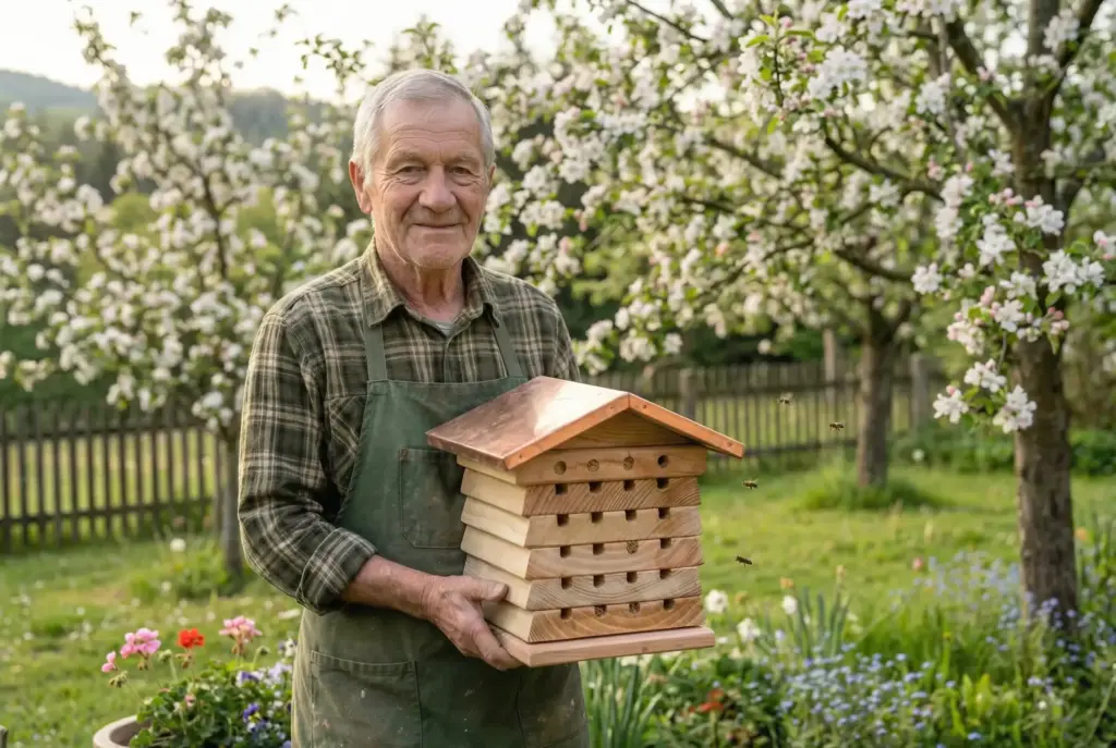 Dieses Rätsel ließ ihn nicht los. Er begann zu protokollieren. Er veränderte Bohrtiefen, variierte die Durchmesser um Millimeter und testete verschiedene Holzarten. Er sprach mit Biologen und wälzte Fachliteratur über die Nistgewohnheiten von Mauerbienen und Scherenbienen. Das Ergebnis dieser lebenslangen Forschung ist das „Blütenwächter“-Bienenhotel. Benannt nach seiner Funktion als Schutzschild für unsere Bestäuber, ist es die Essenz aus 43 Jahren Erfahrung. Es ist ein Lebensraum, der auf echtem Wissen basiert – nicht auf Vermutungen.