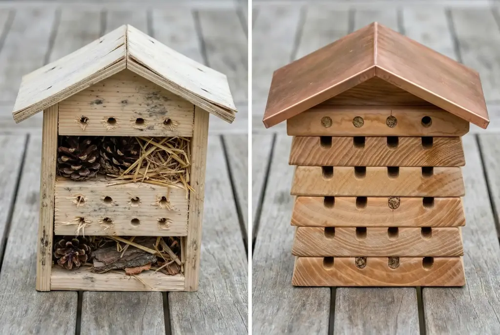 – Die „Sinnlos-Füllung“ (Deko-Kitsch): „Schauen Sie sich die Baumarktdinger an: Da stecken oft Tannenzapfen oder Stroh drin. Das sieht für den Menschen nett aus, ist für Wildbienen aber völlig nutzlos. Es zieht nur Spinnen und Ohrenkneifer an, die dann die Bienenbrut rauben. Ein echtes Hotel besteht aus massivem Holz mit exakten Bohrlöchern – nichts anderem.“