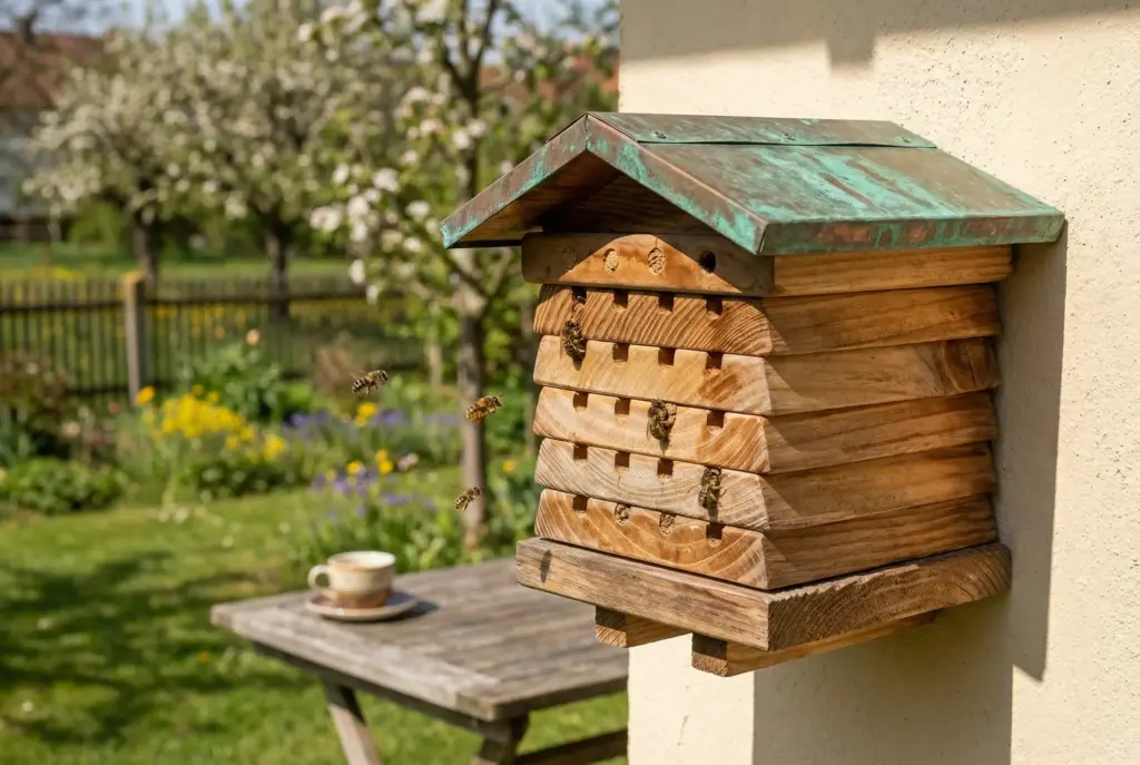 – Die „Kupferschild“-Architektur: Das massive Kupferdach ist kein Design-Element. „Kupfer rostet nicht und leitet das Wasser so effizient ab, dass das Holz darunter niemals feucht wird“, so Heinrich. Feuchtigkeit ist der größte Feind der Bienenbrut, da sie Schimmelpilze begünstigt, die ganze Generationen vernichten können.