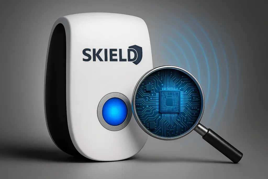Der BugShield™ gibt feine Hochfrequenzwellen (30–50 kHz) ab – für Menschen und Haustiere unhörbar, für viele Insektenarten jedoch störend in ihrer Orientierung und Kommunikation.