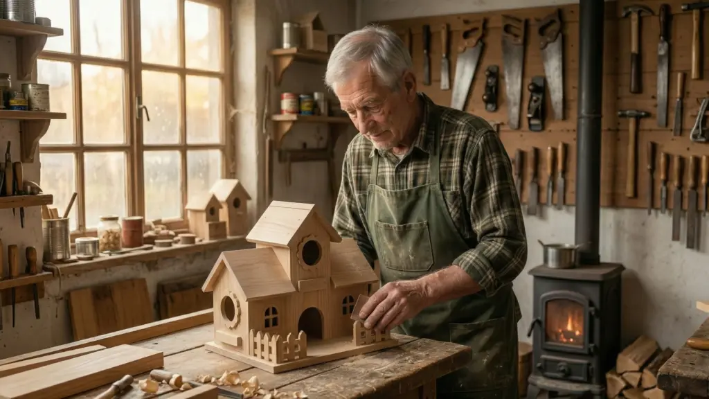 Wenn man Heinrich auf industrielle Vogelhäuser anspricht, wird der ruhige Thüringer deutlich. „Die Leute kaufen diese Dinge mit den besten Absichten“, sagt er und lässt den Hobel sinken. „Aber was sie nach Hause tragen, ist Dekoration – kein Lebensraum. Es ist, als würde man versuchen, in einem Zelt aus Papier zu überwintern.“